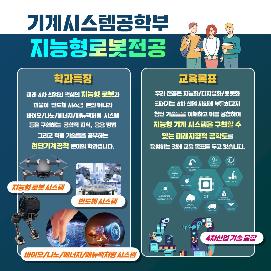 지능형로봇전공은 기계공학을 기반으로 전자·전기, 컴퓨터공학, 인공지능을 융합해 이동·조작 로봇, 자율주행, 환경인식, 스마트팩토리, 휴머노이드, 드론 등 차세대 로봇 기술을 설계·구현할 인재를 양성. 로봇 기구학, 동역학, 제어공학, 컴퓨터 비전, 인공지능 등을 배우고 캡스톤디자인과 각종 프로젝트로 실제 로봇 플랫폼에서 보행·조작·이동·비행·군집제어에 대해 실습하며 산업 현장 경험을 쌓아 미래 로봇공학을 이끌 전문성을 키우고자 함.