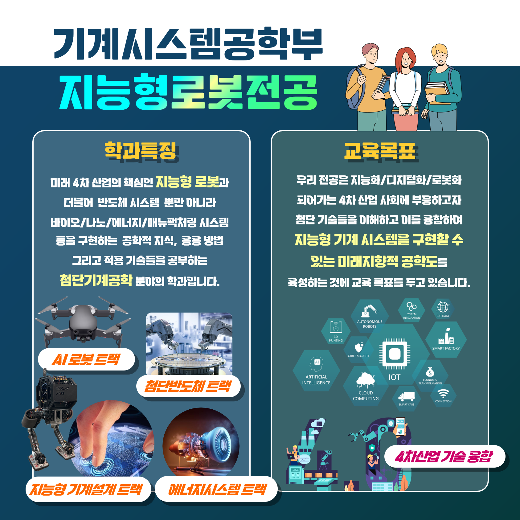 기계시스템공학부/지능형로봇 전공은 지능형 로봇뿐만 아니라 상기 심화과목의 활용이 가능한 여러 첨단 기계산업 분야에 대응하는 교육· 연구 프로그램을 마련하여 인재를 양성하고 새로운 지식을 창출하고 있습니다. 이를 위해 4개의 심화 트랙(AI로봇, 지능형 기계설계, 첨단반도체, 에너지시스템)으로 구분하여 첨단산업에 특회된 교육과 연구를 실시하고 있습니다. 학생들은 본인이 원하는 트랙을 선택하여 첨단산업에 특화된 인재로 성장할 수 있으며, 2개 이상의 트랙을 병행하여 융합형 인재로 자리매김할 수도 있습니다.